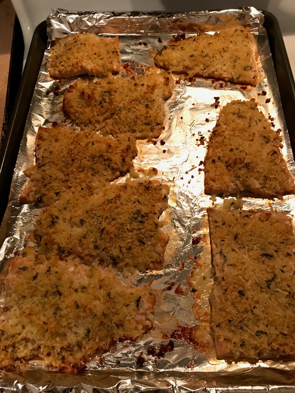 Panko Parm topping on salmon fillets on sheet pan