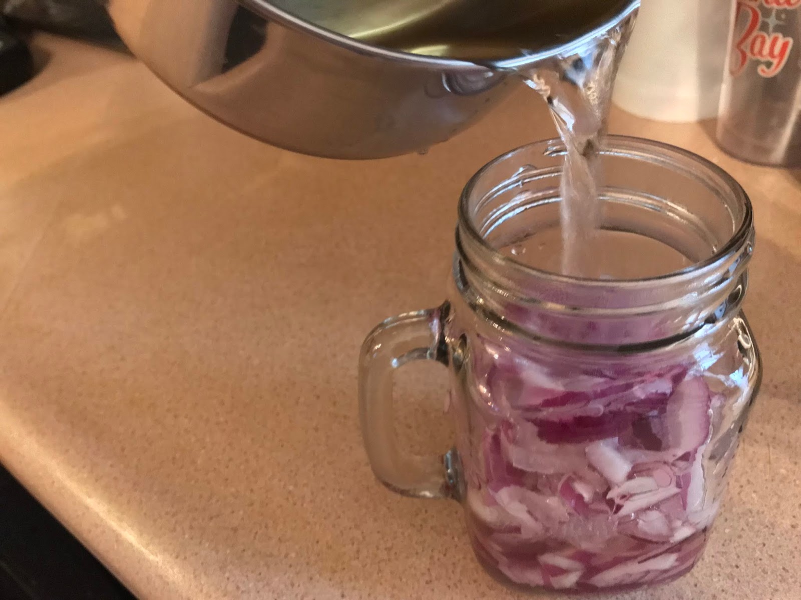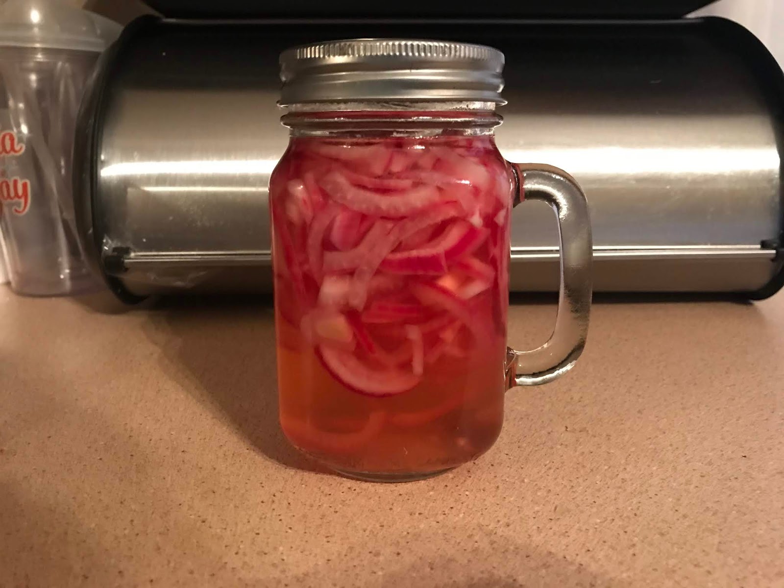 Look at that beautiful pink color that they take on after 1 hour. If you have to have them quickly wait at least an hour before eating them so that it has enough time to pickle. It turns out I could've added more onions to my jar.
