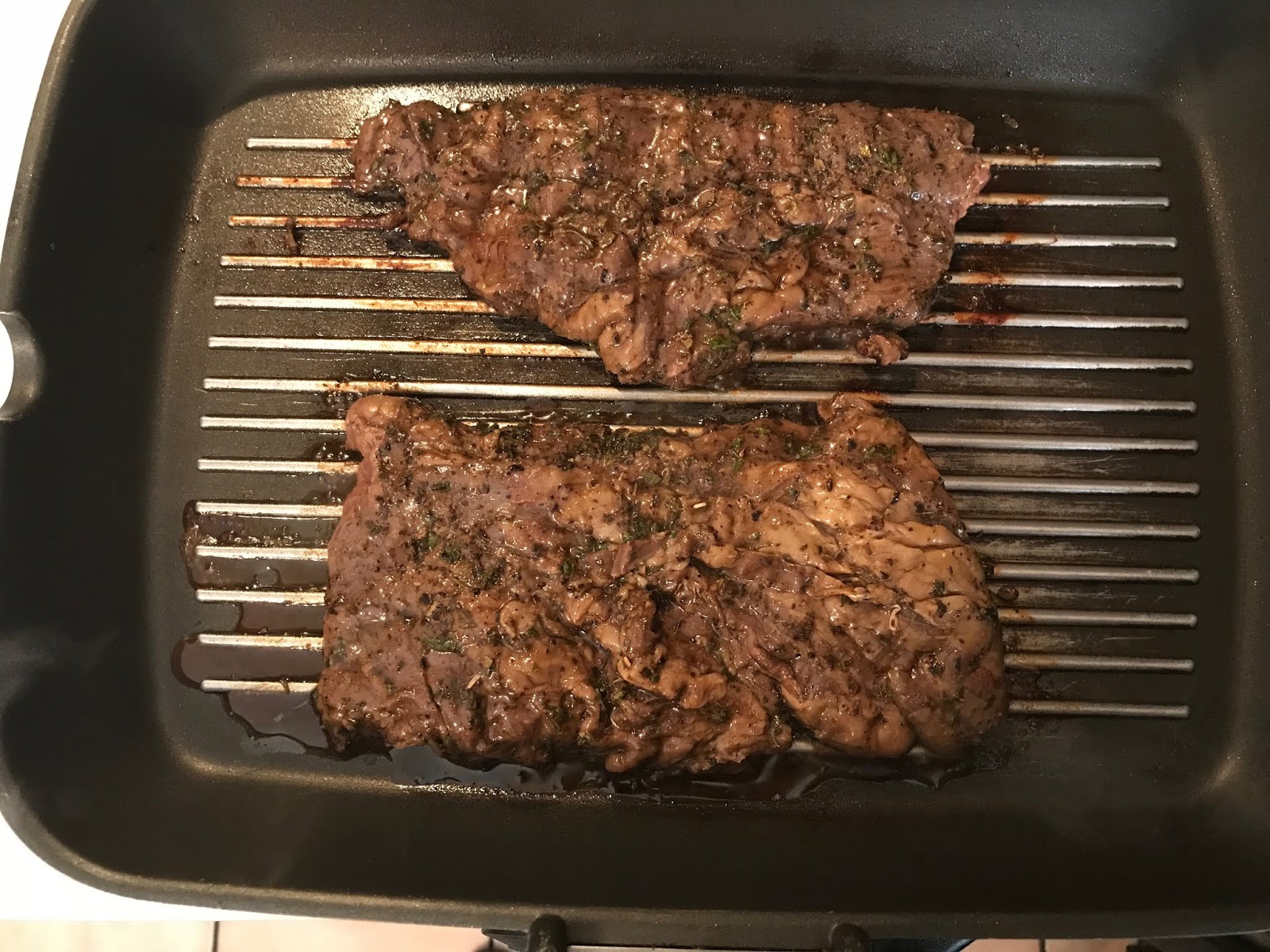 • Cook the steak in a grill pan over medium high heat for 4 minutes on each side for a medium doneness.