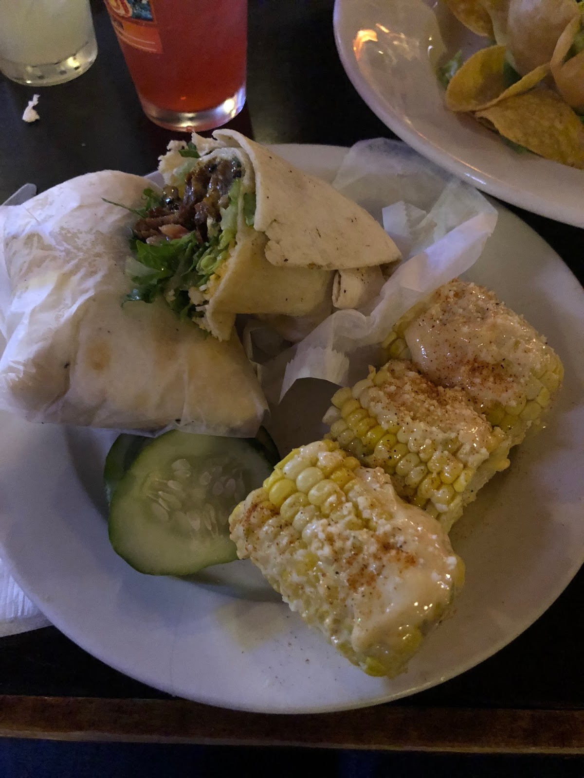My friend ordered the Carne Asada Wrap which is grilled flank steak with a creamy avocado sauce and served with street corn. If you are unaware of what Mexican style street corn is, it's corn on the cob with mexican crema, cotija cheese, and chili powder. Many places have different variations of it but that's the original version. As you can see she clearly was getting her Mexican food no matter where we ended up. I tasted the corn and it was good, I love corn. She raved about the wrap and thought it was delicious. It's a monthly special at this restaurant so if it's not there when you go, that is why.
