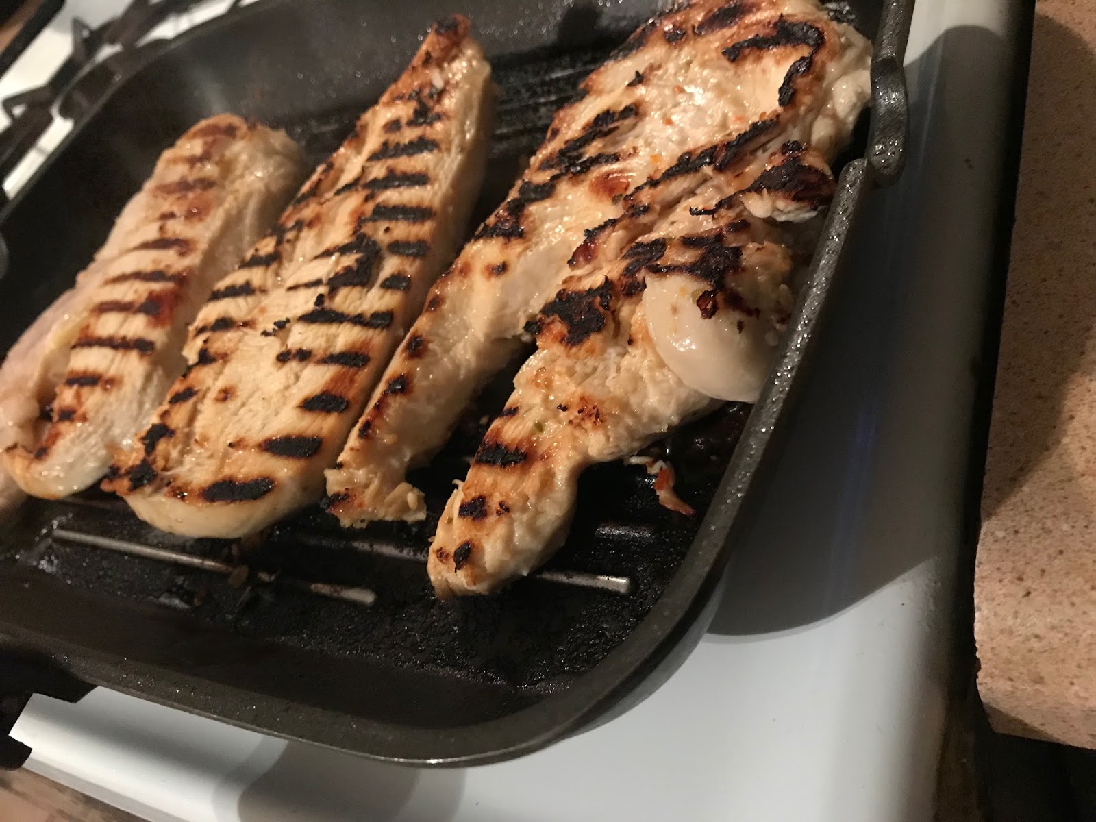Heat a grill pan and spray with cooking spray. Cook the chicken for 7-10 minutes and flip.