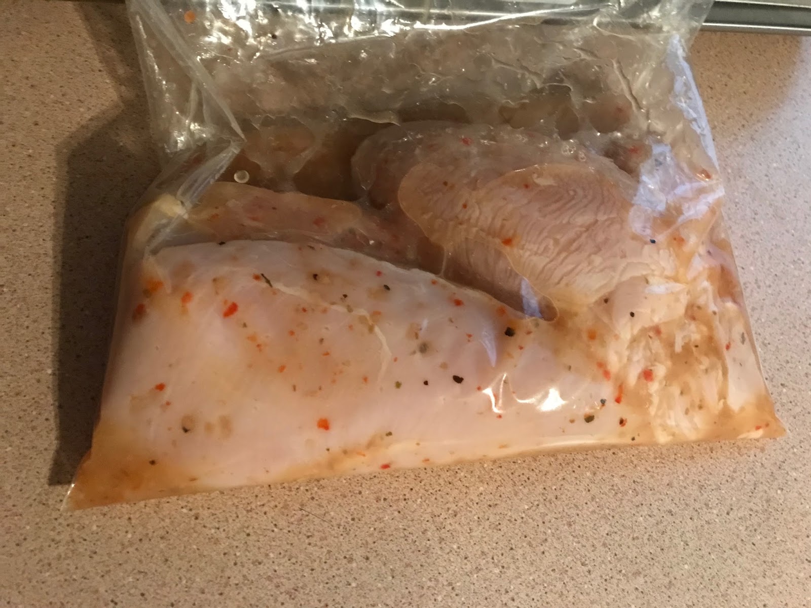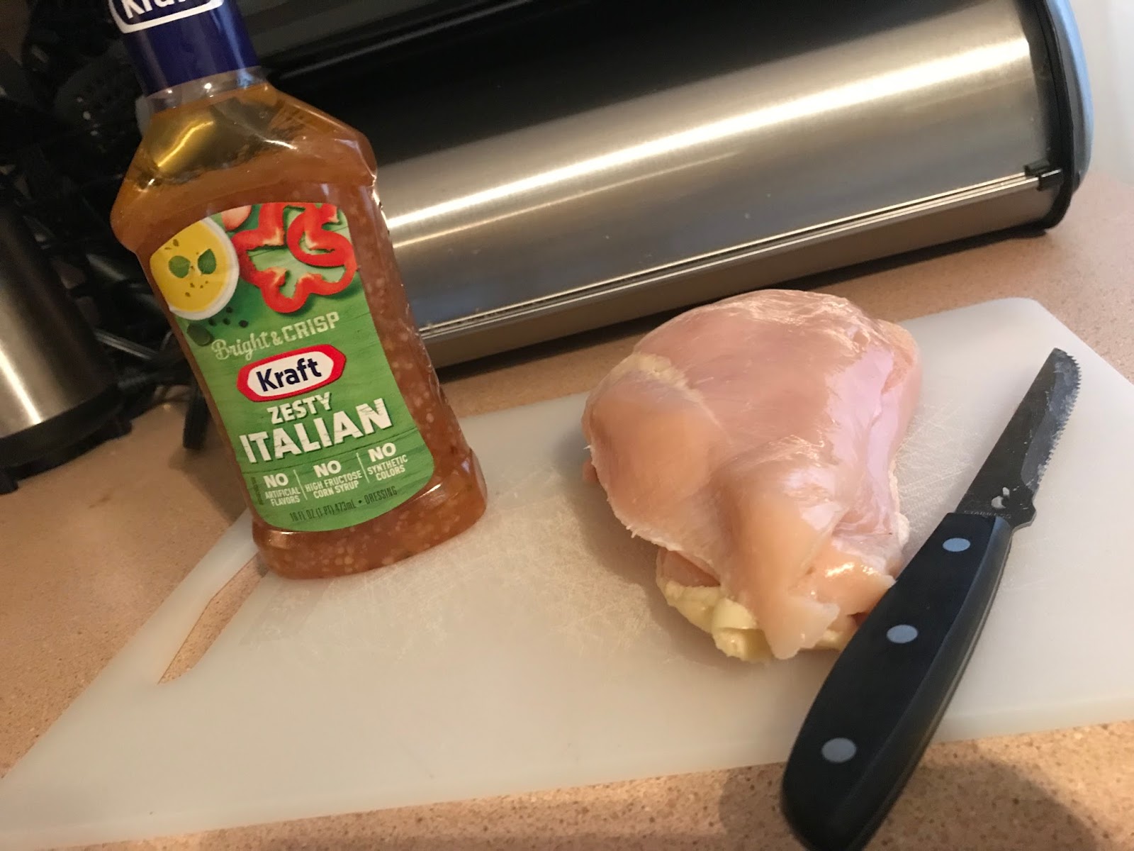 Take the chicken and put them in a resealable plastic bag with the italian dressing. I like to massage it a little to make sure it's getting in there. Refrigerate for 1-2 hours. Take the chicken out of the fridge 30 minutes before cooking to knock the chill off before cooking.